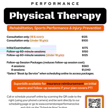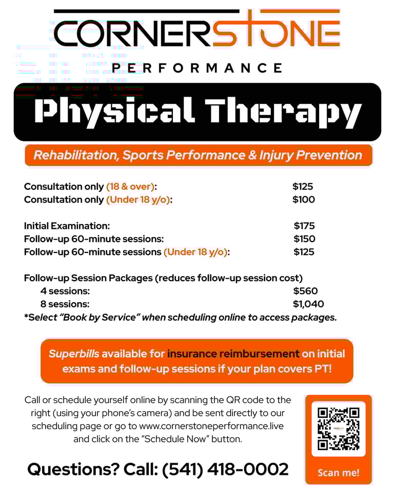 Click on any service at the top of the page you would like to schedule and you will be redirected to Cornerstone Performance's PTeverywhere site to schedule that exact service. You can also click on any number of the "Schedule Now" buttons on our website. Or, simply click on the scheduling link at the top of this page, and then click the "Schedule Now" button on the next page. You will be directed to Cornerstone Performance's PTeverywhere site in this manner as well. From there, you can select the service you would like to receive, and schedule. If you have questions or are having trouble scheduling, please call 541-418-0002.
